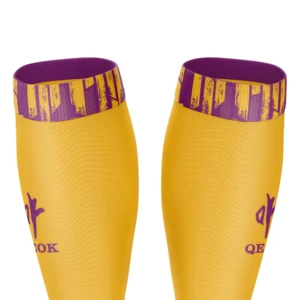 • Custom Yellow and Purple Soccer Socks – Breathable Stretch Knit with Brush-Pattern Cuff, Cushioned Sole, and Full Team Customization by QEOK